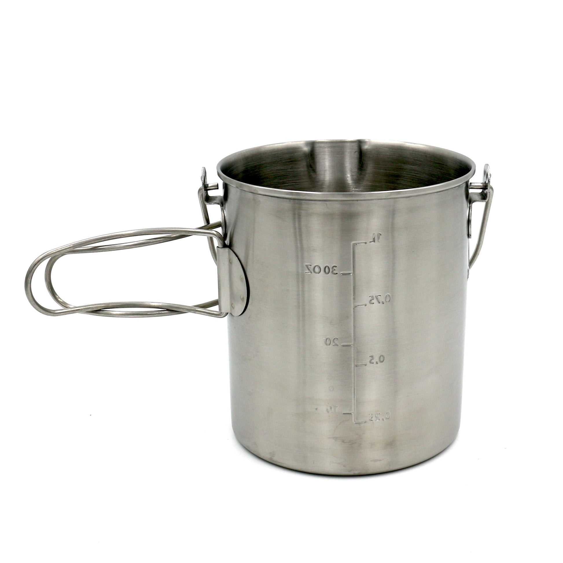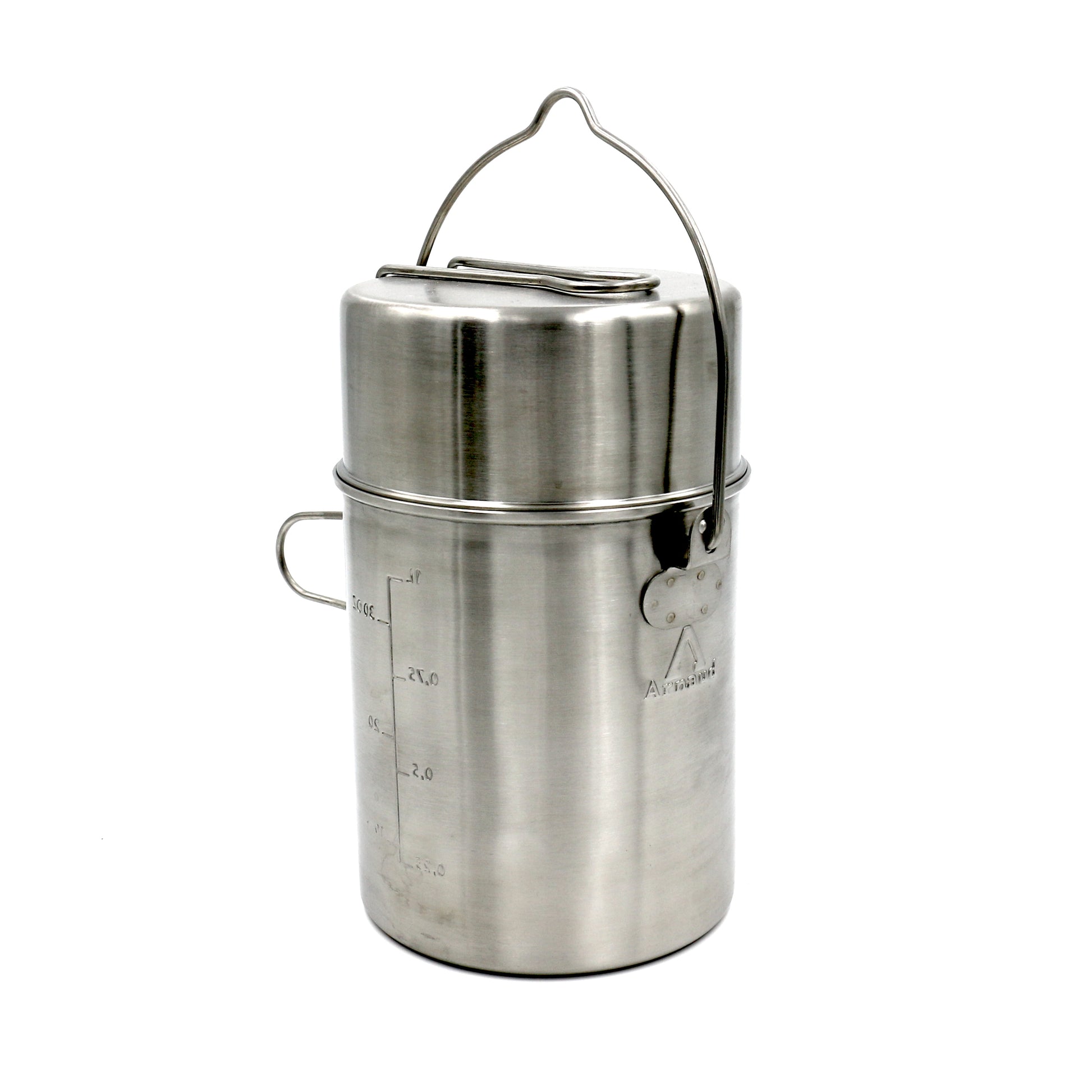 The pot features volume markings, folding handles, and a top handle. A pan that also functions as a lid fits on top of the pot.